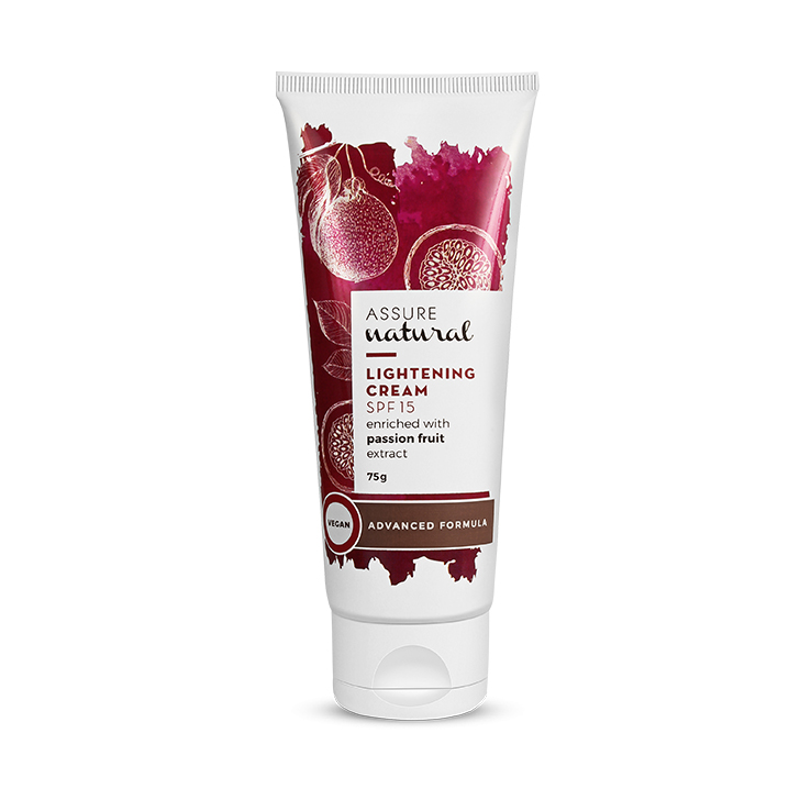Assure Natural Lightening Cream with SPF 15 increases hydration, restoring the skin’s structure and combats oxidative stress that causes premature ageing and dark spots. Enriched with passion fruit extract, which is high in Vitamin C and antioxidants, it keeps the skin firm and youthful.